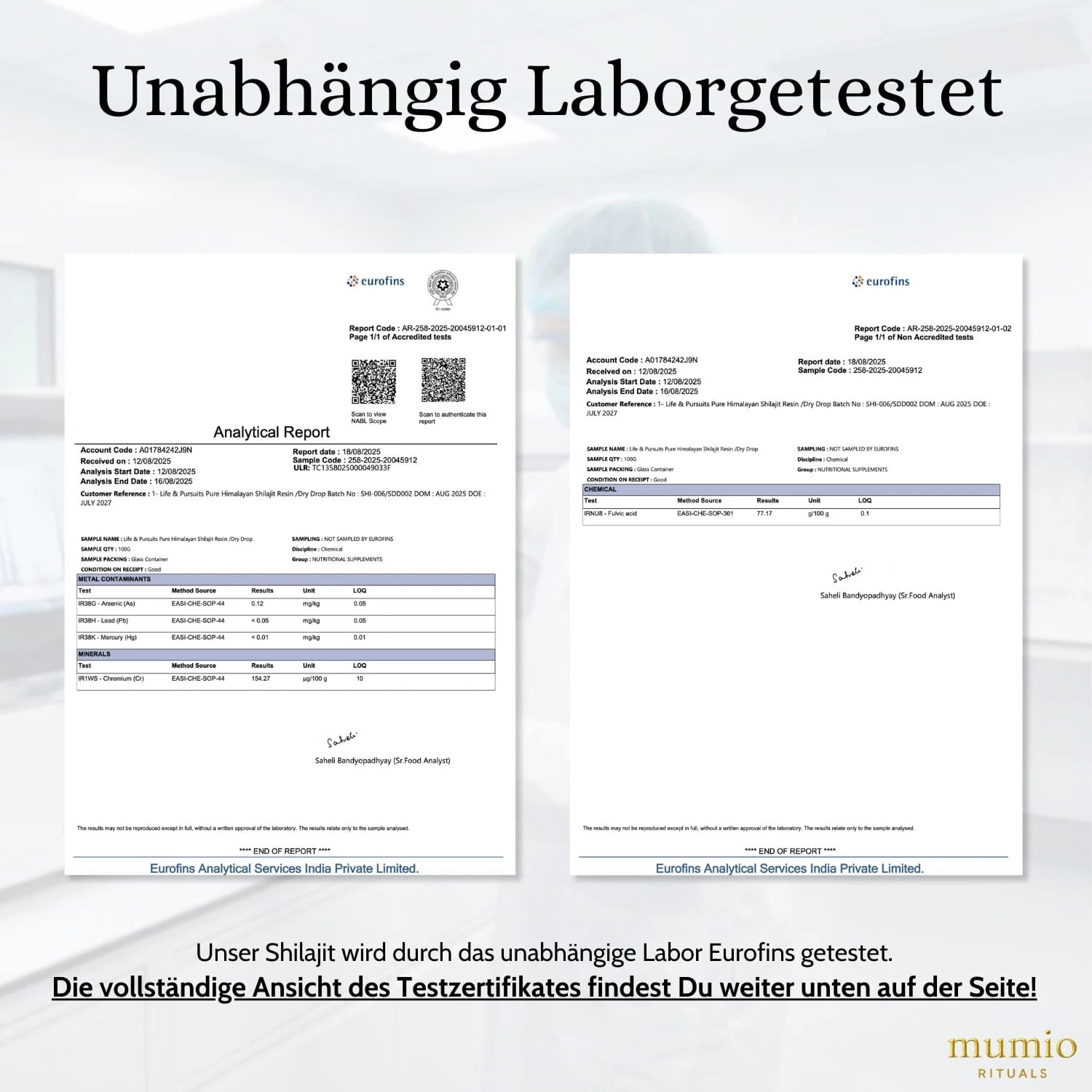 Viele Anbieter arbeiten ohne Impressum oder mit veralteten, oft gefälschten Zertifikaten. Ein seriöser Labortest muss aktuell sein und einen QR-Code zur offiziellen Verifizierung besitzen. Unser Shilajit wird vom unabhängigen Labor Eurofins intensiv auf Schwermetalle und Verunreinigungen geprüft. Wir belegen zudem den exakten Fulvinsäuregehalt schwarz auf weiß – für echte Sicherheit statt bloßer Behauptungen.