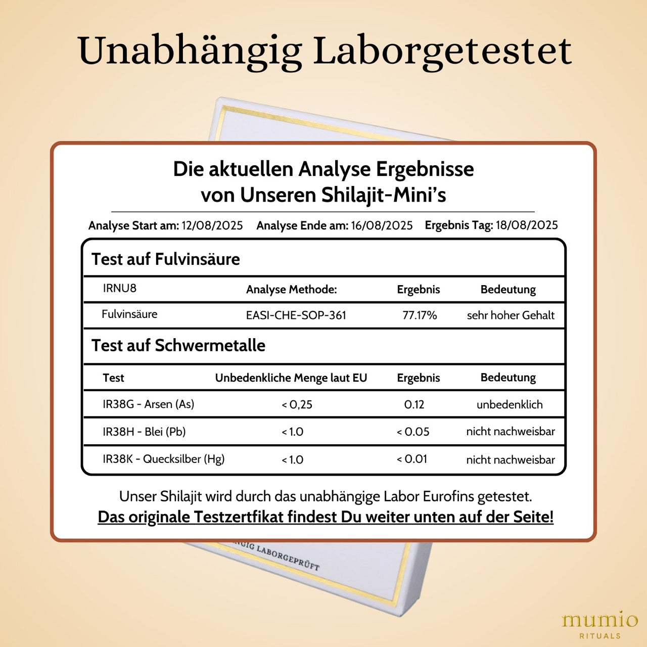 Ja, jede Packung Mumio Shilajit wird von unserem Partnerlabor intensiv auf den Fulvinsäuregehalt, Schwermetalle und andere Verunreinigungen geprüft. Durch den einzigartigen Entstehungsprozess kommt Shilajit in Berührung mit vielen verschiedenen Gesteinsschichten. Deshalb kann Shilajit oft mit Schwermetallen belastet sein. Eine gründliche Kontrolle ist daher besonders wichtig.