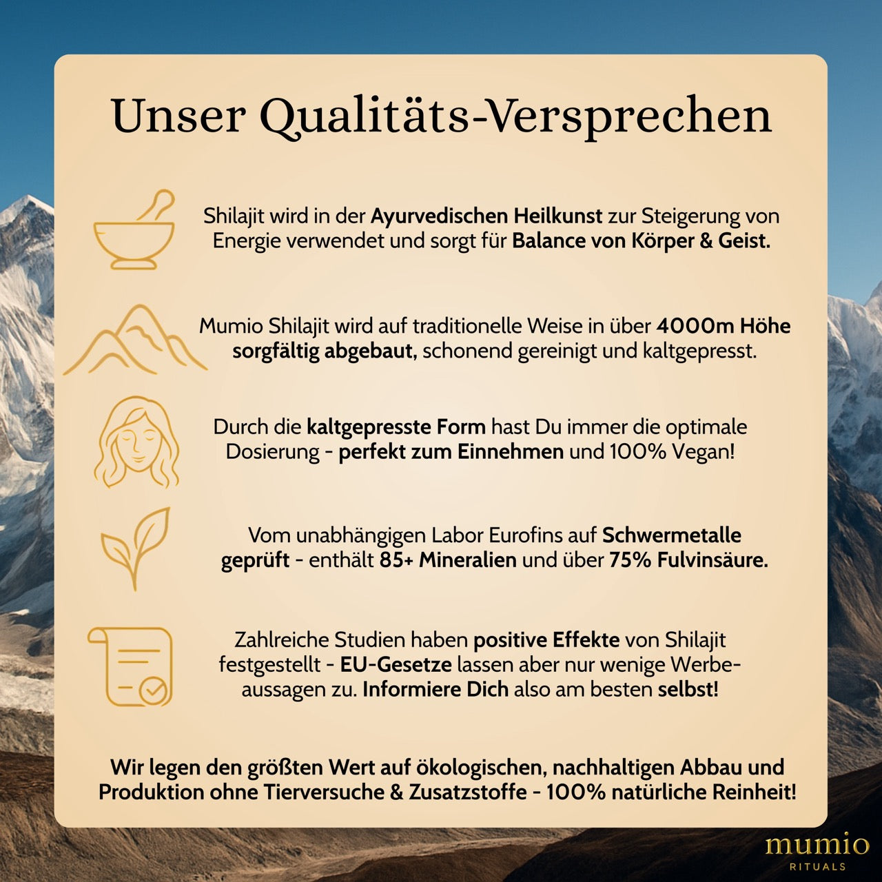 Shilajit entfaltet seine Wirkung am Besten, wenn es über einen längeren Zeitraum eingenommen wird. Deswegen bieten wir Dir ein Shilajit-Abo an, in dem Du monatlich Mumio Shilajit Minis mit 25% Rabatt erhältst! Das Abo kannst Du jederzeit unkompliziert kündigen oder pausieren. Gehe einfach in der Abo-Bestätigungs-Mail auf den Link "Abo verwalten" oder schreibe uns eine Email unter info@mumio-rituals.de.