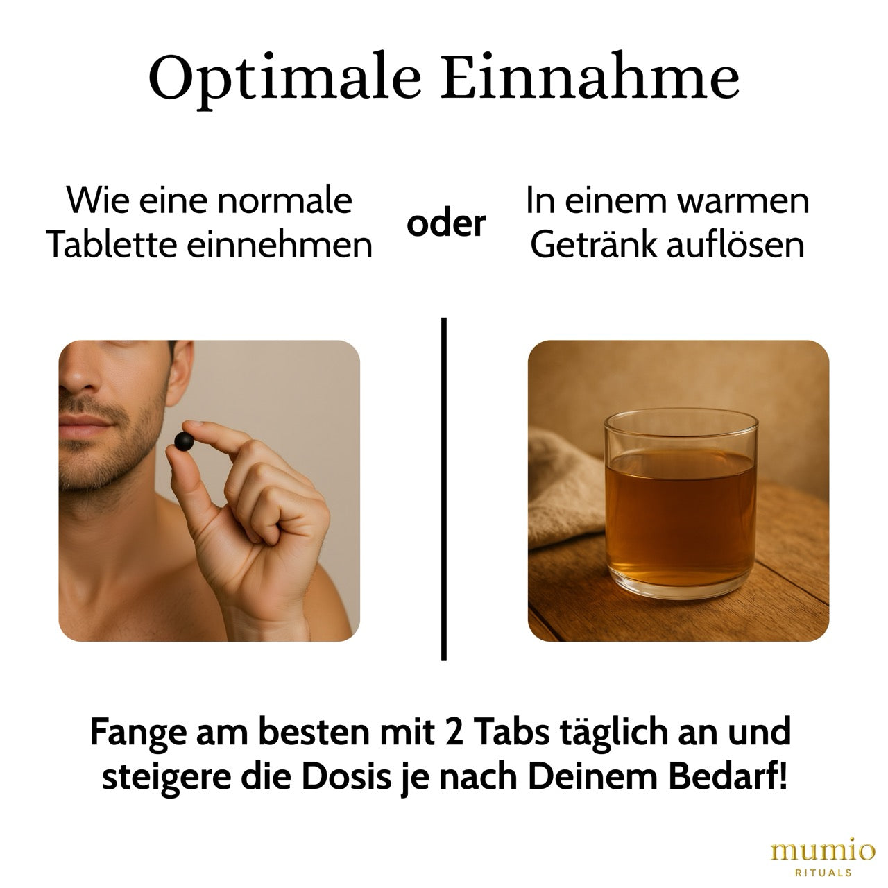 Milch oder Pflanzenmilch erwärmen (nicht kochen!) und 1-2 Mumio Tabs dazugeben. Umrühren bis aufgelöst.